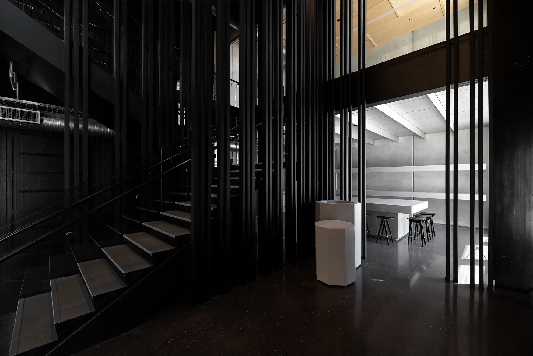 This concept is illustrated by the Halcyon Headquarters & Distribution Centre. This building’s exquisite jet-black interior is fitted out with Featurecraft’s MDF battens in a Black Smoked Oak veneer. Approximately eight metres tall, these magnificent battens form a balustrade and screen around the internal scissor staircase, a masterclass in artistic space-making that is sure to inspire commercial designers for years to come.