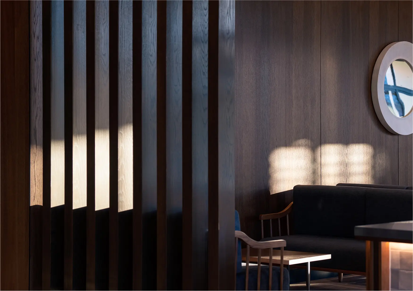Another prime example: the Queenstown Country Club’s clubhouse. Architects Warren and Mahoney used Featurecraft’s fire-rated MDF battens with timber veneers to create screen dividers, sectioning the interior into smaller rooms. These screens were custom stained to mimic the dark ‘refined alpine’ aesthetic chosen for this project. The result: a series of moody, sophisticated showpiece screens that beautifully demarcate different areas within the clubhouse.